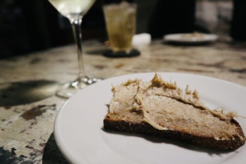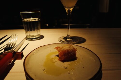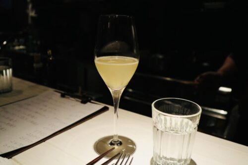 まず、ウェルカムドリンクのスパークリングワインとお通しが出てきます。「カンパーイ!!プハー!」と生ビールを飲む陽気さとは違い、ぬるりと胃を熱くするワインがゆっくりと身体を暖かくさせてくれます。