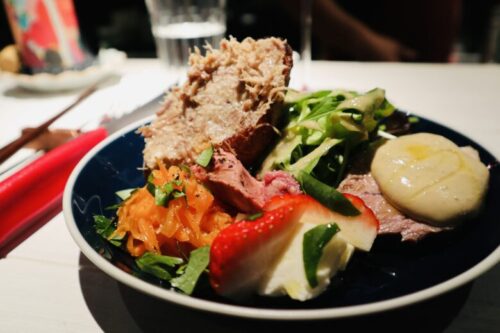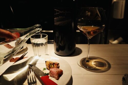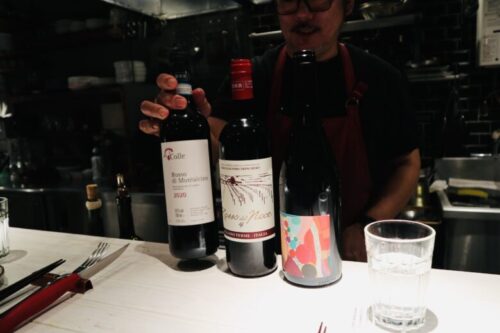 店主菊池さんの、ボトルワインの上の方と下の方の味わいに違いを感じて欲しいというお話を聞き、ワインは赤のボトルを注文しました。