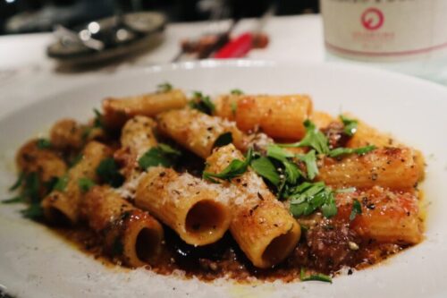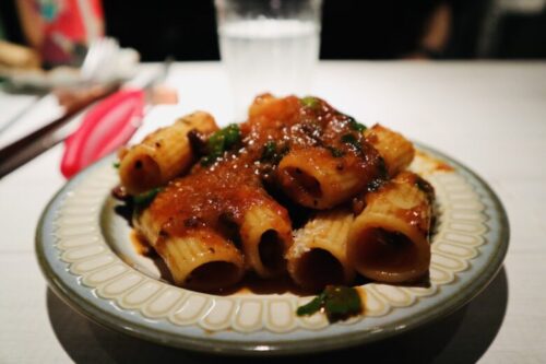 ショートパスタリガトーニ。穴がとっても大きい。パスタの歯ごたえも馬の程よい歯ごたえもお腹を満たしてくれます。