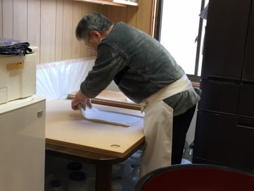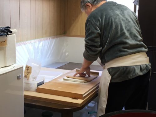 中に入ると、玄関を入ってすぐ左の部屋で、ちょうどご主人がそばを打たれているところでした。