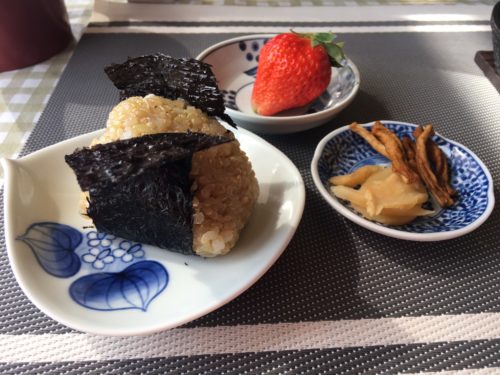 さらに、古代米のおにぎりと漬物、大きないちごまでついて、大満足の内容でした。これで1,600円は、とってもお得!