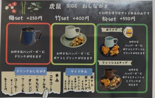 それに伴いモンパリにてハンバーガーの販売は終了となってしまいましたが、2025年の1月にオープンしたこちらの「虎鼠BURGER」(こそバーガー)にてゆっくりと食べられますので、今回人気メニューをご紹介いたします。