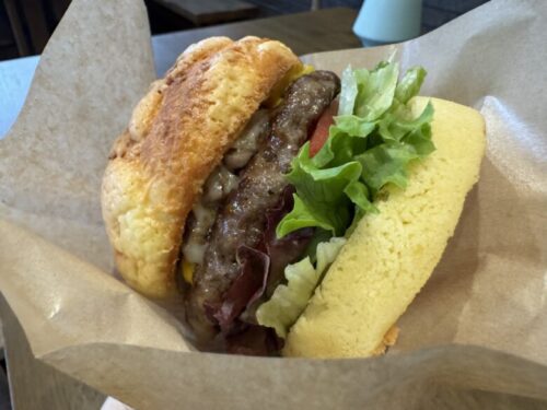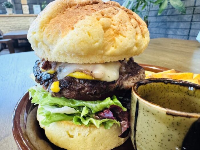 メロンパンのベーコンチーズバーガー1,100円。竹setなのでプラス400円で1,500円。(価格は2025年取材時のものです)。