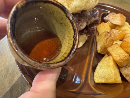 メロンパンが高級感があっていいんですよ。ちょっと柔らかめのスコーンといっても良いくらいに、さくっとしておりました。なので、肉汁がメロンパンにじゅくじゅくに染み込むという事がなく、きちんと口で混ざる瞬間に、この旨味を感じるんです。