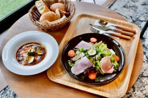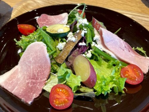 阿蘇健康農園のみずみずしいレタスに、熊本県産の野菜、阿蘇自然豚のハム、そして熊本ミルクのリコッタチーズなど、素材すべてが宝石のようにきらめいているサラダはとっても美味しくて、単品で注文する方もいらっしゃるほど。