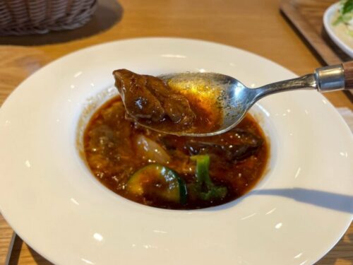 あか牛はほろほろに崩れるほど柔らかく、ソースも重たさのないさわやかな味で、美味しいビーフシチューです。