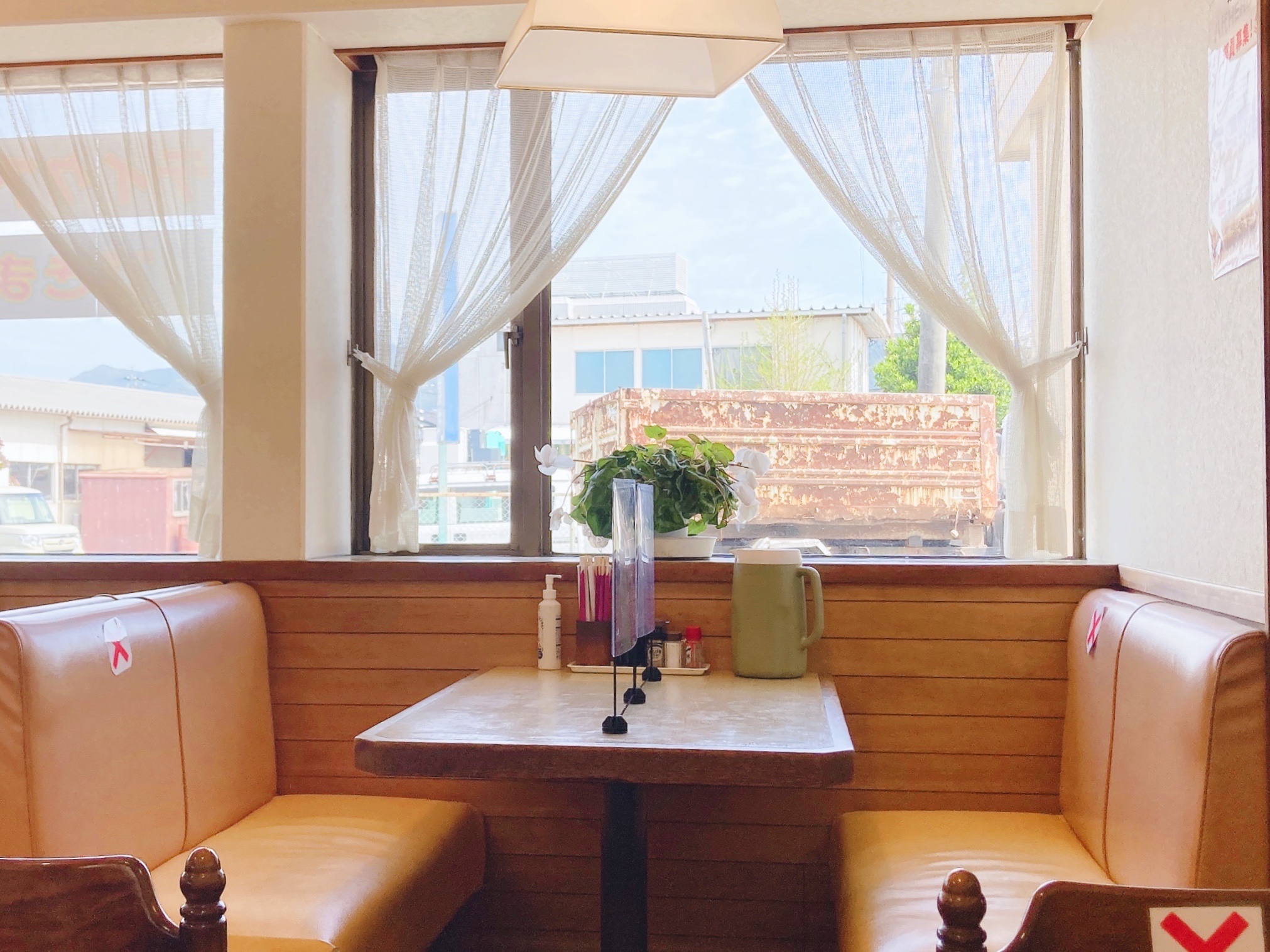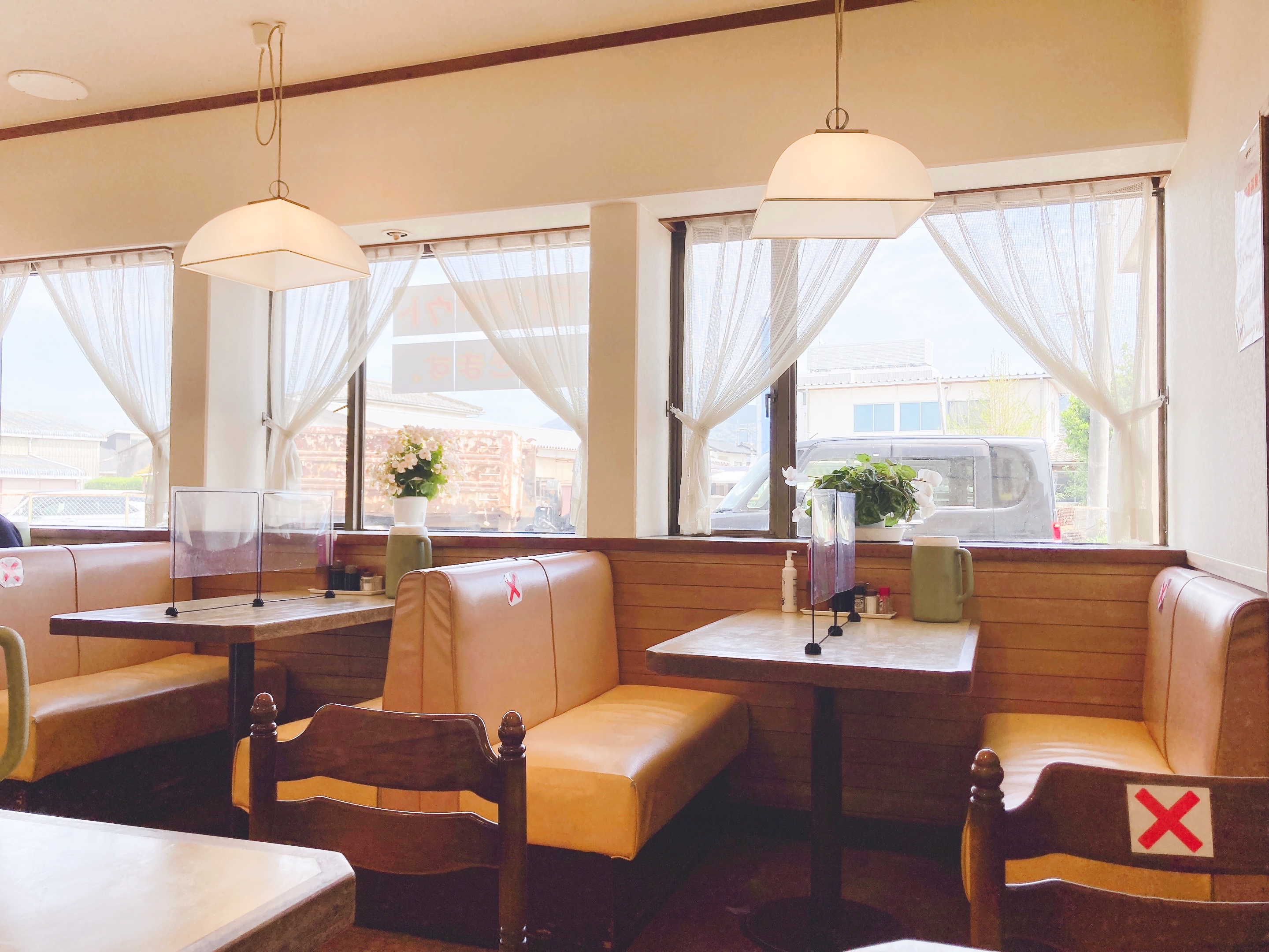 ファミリーレストランみたいな個別のソファ席がとっても味があります。