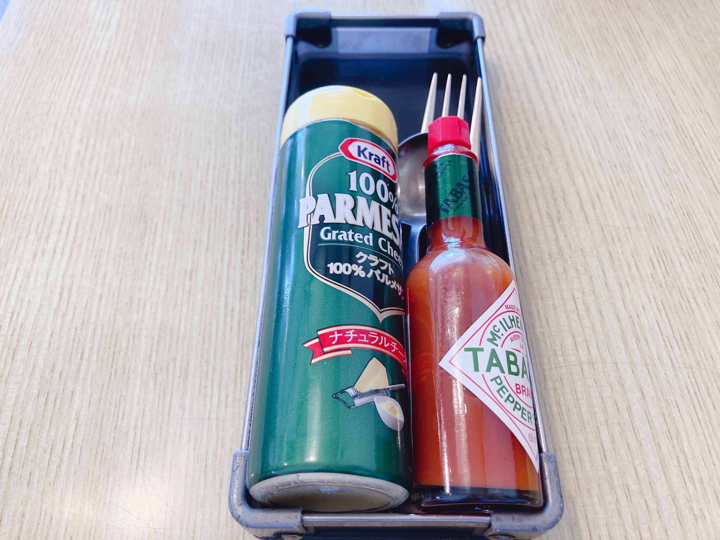 ナポリタンを注文したら出してくださった粉チーズとタバスコ。お好みで味変できます。
