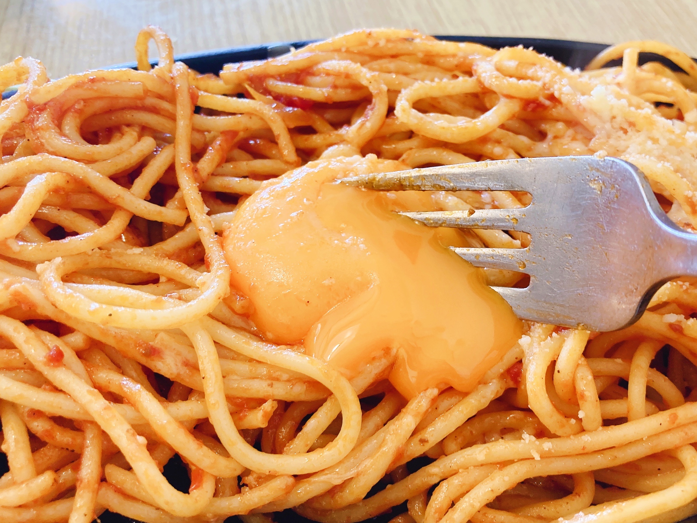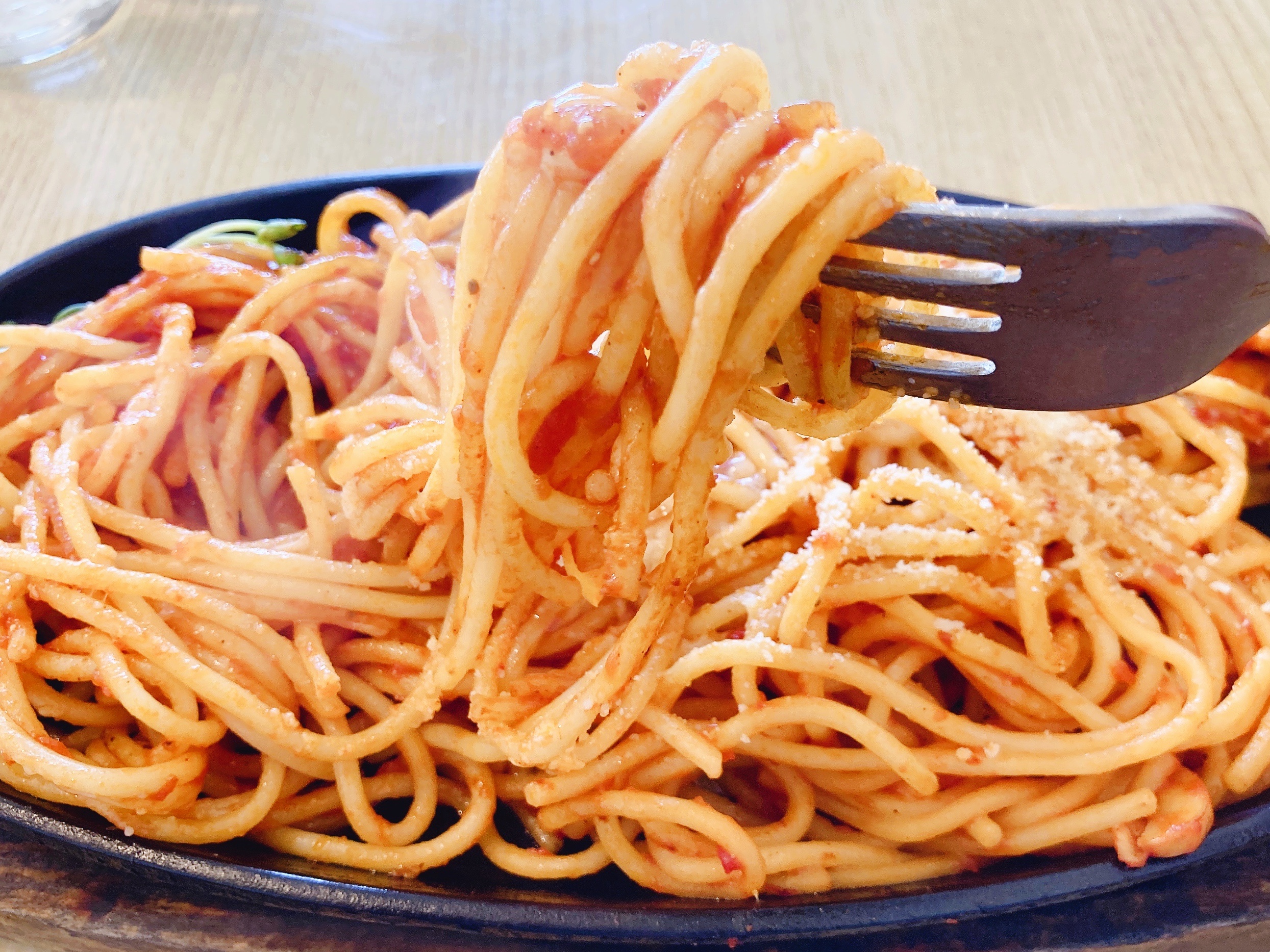 粉チーズをたっぷりと。熱々鉄板のおかげでスパゲッティがずっと熱いので、粉チーズが溶けてとろとろに。たっぷり絡めてまろやかに。