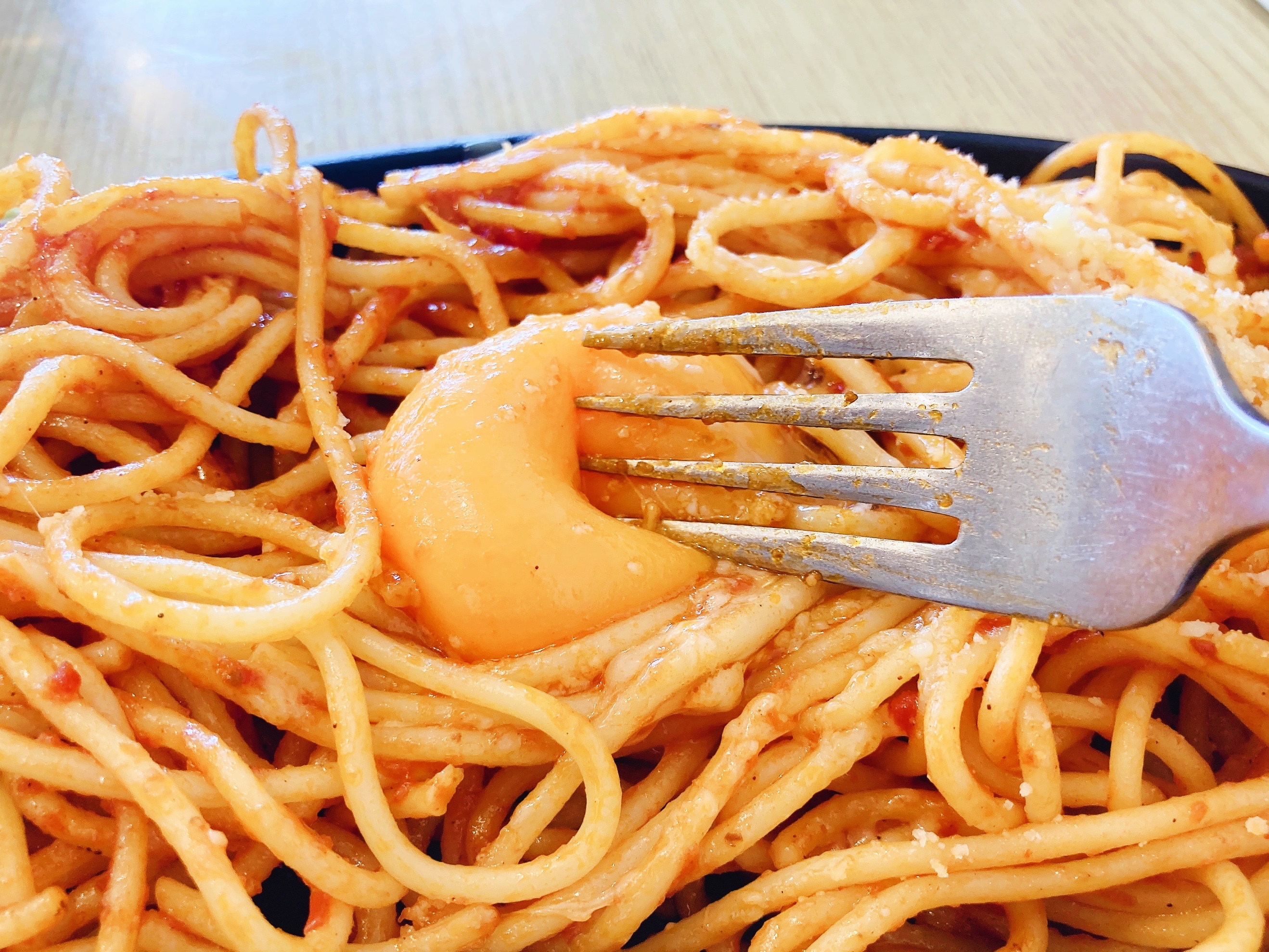 スパゲティは程よい硬さ。甘めのケチャップの味付がとっても美味しいです。