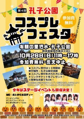 近年、熊本でも年間行事のひとつとなっている「ハロウィン」。街中で仮装している人たちが目立ちますが、それ以外にもハロウィンの時期に合わせて菊池市泗水泗水町の孔子公園で、「コスプレフェスタin孔子公園」が4年前より定期開催されています。