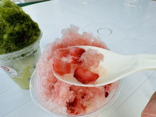 美味しそう~!抹茶、苺、それぞれに下にはソフトクリームが入っております。ソフトクリームとかき氷が食べられるのは贅沢!