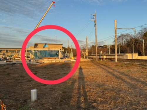 その菊池電車に背を向ける感じで、大きな商業施設が建設中。こちらには100円ショップや食品スーパーマーケットがオープン予定ですが、詳細はまだ分かりません。