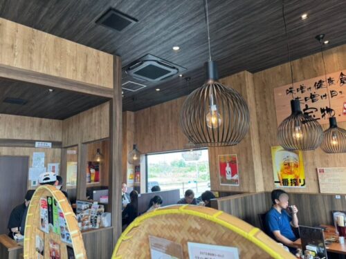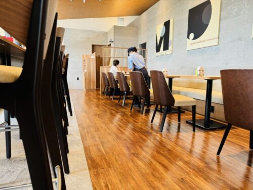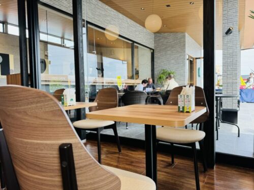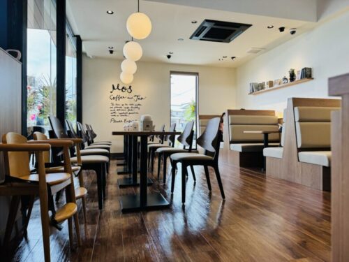 こちらのモスバーガーは、いい意味でモスバーガーらしくない、木目を基調とした広々空間。