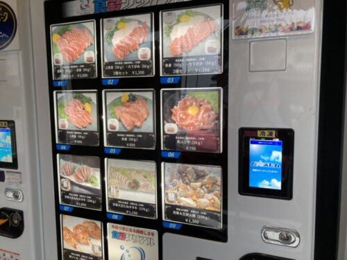 こちらは馬刺しや天草大王のタタキの自販機です。仕事帰りにおつまみとして買っていく人も多いそう。