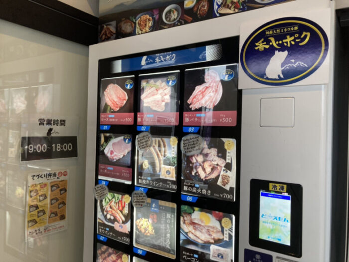 飼育方法や飼料、環境にとことんこだわった香心ポークを育ているコーシンが運営されているので、自販機でも香心ポークが購入できるのはもちろんのこと…