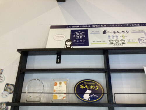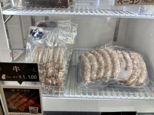 香心商店では24時間営業の自販機の他に、香心ポークと無添加の加工品やお惣菜も