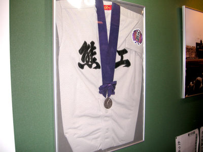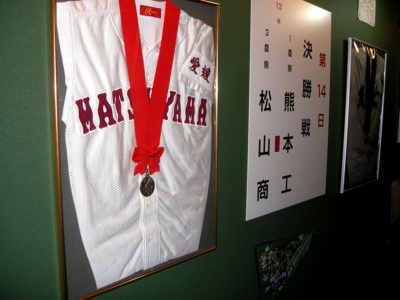 店内に入るといきなりの超レアアイテムが!23年前当時の熊本工と松山商のユニフォームが飾られていました。