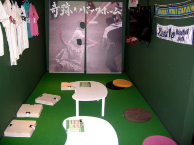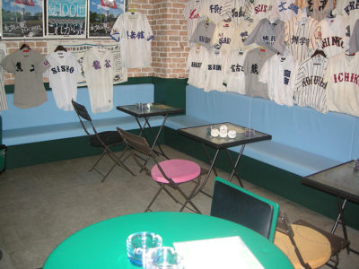 店内奥には、靴を脱いでゆっくり入れる団体用スペースがあり、床はまるで球場の芝生のよう!座布団が塁ベースの形になっているのもユニークですね。TVモニターで、甲子園のDVDや、プロ野球中継をみんなで観て楽しむことができます。
