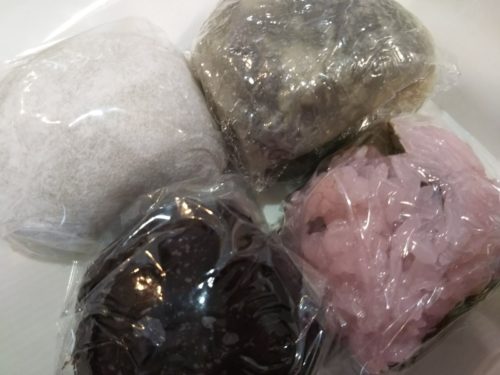 左上から「米の粉団子、いきなり団子」。左下から「おはぎ、桜餅」です。