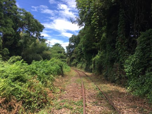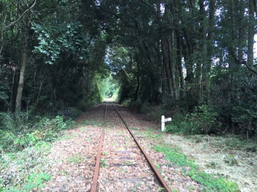 緑色の木々に、奥まで続くレール。