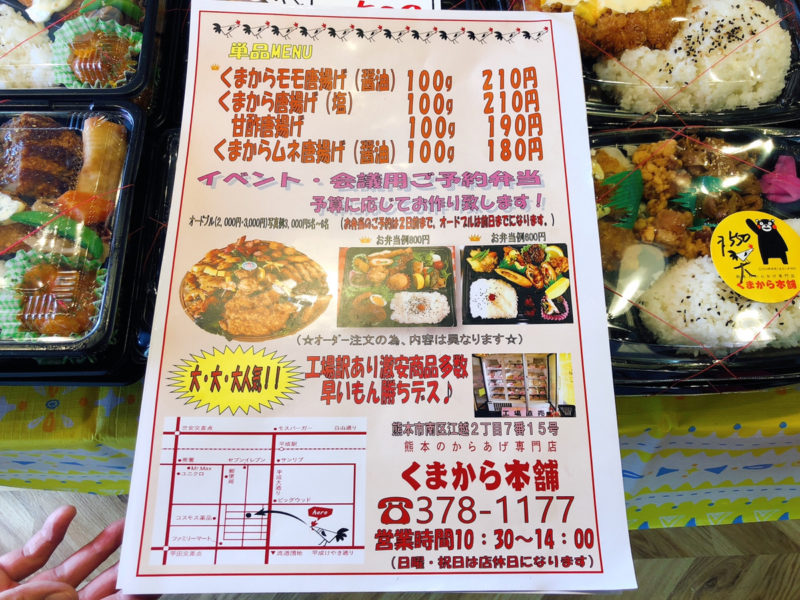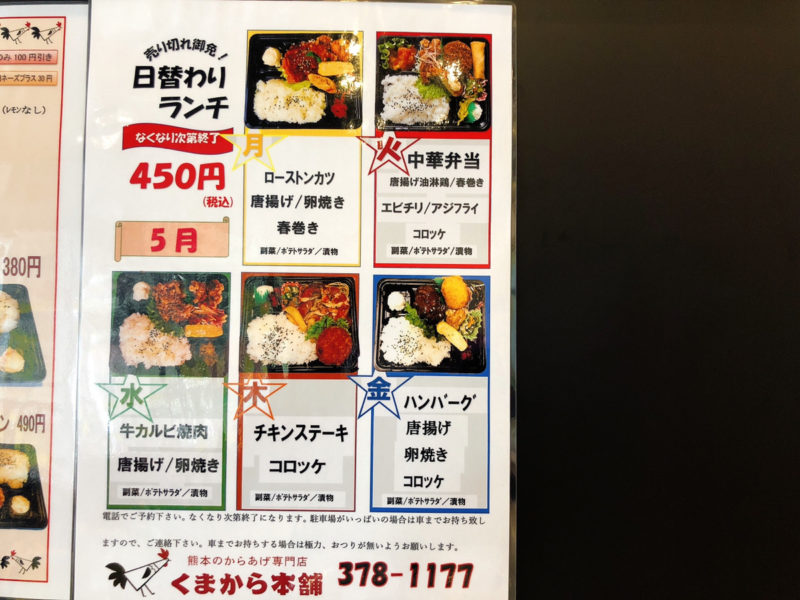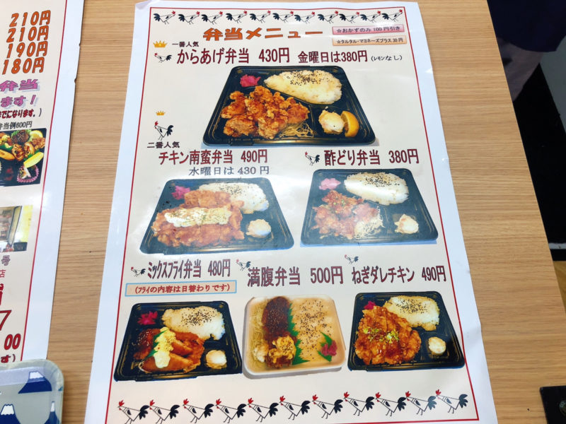 メニューにはお弁当5種類と唐揚げ4種類がありますが、どれも美味しそうです!