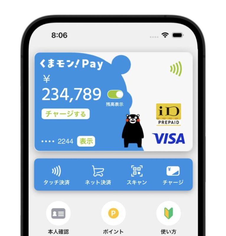 | 利用可能な店舗等 | ①公共交通(九州産交バス(株)、産交バス(株)、熊本電鉄、熊本バス(株)、熊本都市バス、熊本市交通局) ②Visa,ID加盟店 ③県内くまモン!PAY加盟店(2026年春から) ④Visaのオンライン加盟店でのオンラインショッピング |