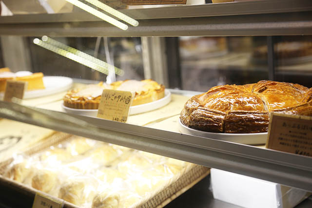 まばゆく光るアップルパイやタルトの入ったショーケース