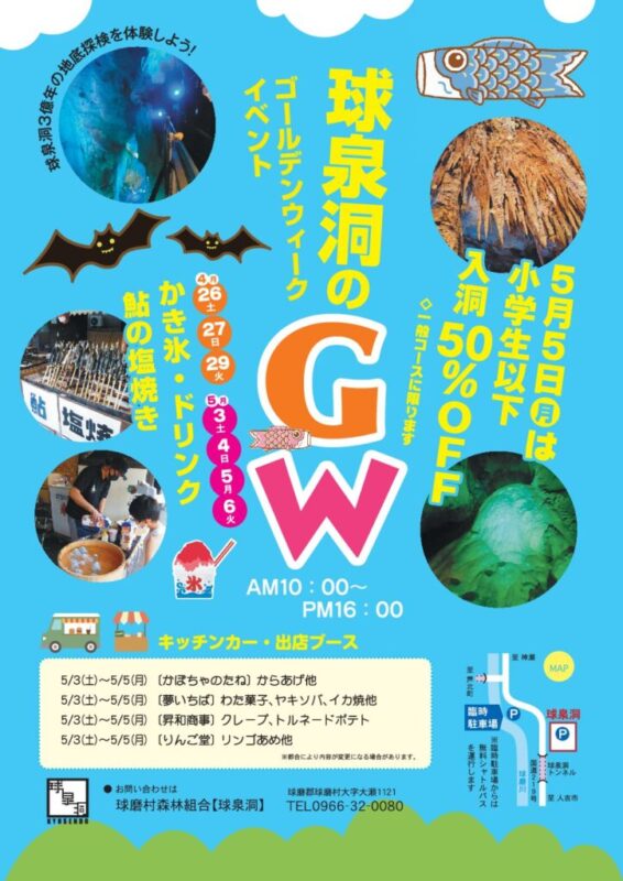 鮎の塩焼き・かき氷・ドリンク販売などグルメを味わえるほか、なんと5月5日は小学生以下入洞料50%OFF!※一般コースに限ります。