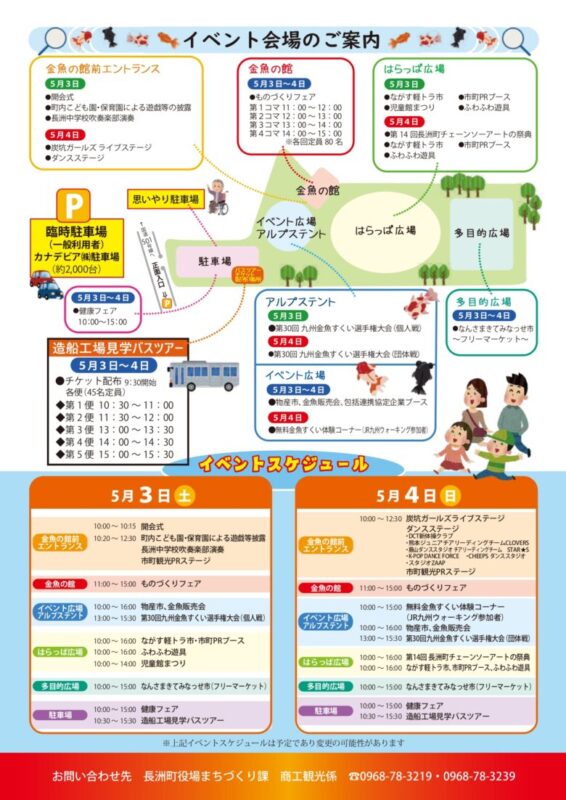 5月3日、4日に金魚まつりが開催されます。金魚すくい選手権のほか、普段はなかなか見ることができない造船工場見学バスツアーなども開催。