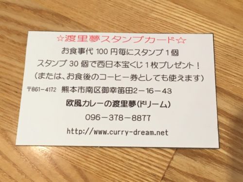 渡里夢で食事をするとこのスタンプカードがもらえます。