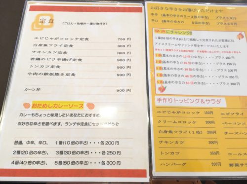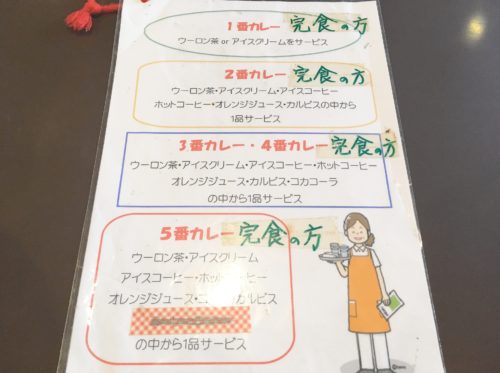 チャレンジカレーは完食するとそれぞれのメニューの中から1つサービスしてもらえます。