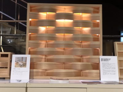 これは津奈木の木魅会(もくみかい)が作った、ヒノキの照明ですね。発足したのは昨年ですが、すでに福岡でのインバウンド施設、KISS福岡 九州国際観光広場での施工や、タイのコンドミニアムで照明として使われたりして人気が高まっています。