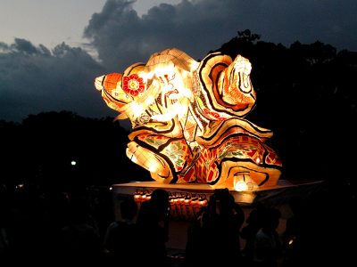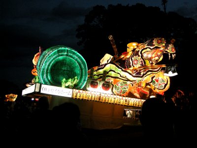 遠くからでも大迫力!山車(だし)の上で、灯籠が勇壮に輝いていました。