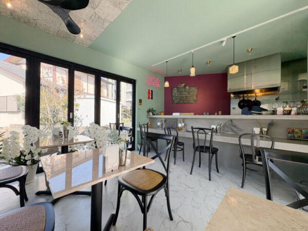 店内は、グリーンベースにワインレッドのアクセントクロスがおしゃれです。