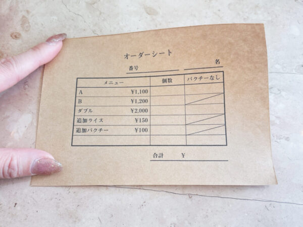 カレーの注文はこちらのオーダーシートに入力して渡します。