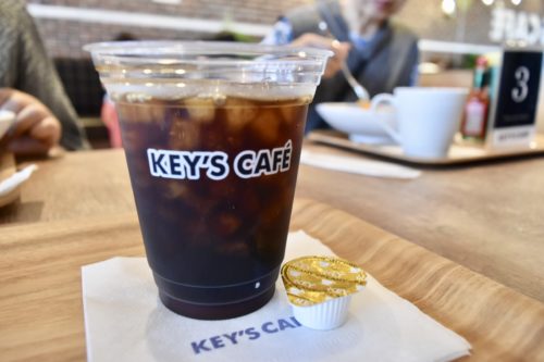 コーヒーメーカーなので、早速コーヒーを!KEY’S CAFÉのコーヒーは、「氷温熟成®珈琲」。0℃以下、凍る一歩手前の「氷温」で保存し熟成したコーヒー豆を、ネル(布製のフィルター)で丁寧に抽出しているそうです。風味やコクがいつも飲んでいるコーヒーと違ってびっくり。ちょっぴり苦味が強いのに、まろやかなので飲みやすい。ぜひブラックで飲んでほしい。ホットだと甘い香りをさらに感じますよ。