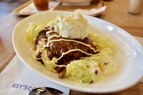 真ん中にドーン!と乗ったハンバーグが目を引く「デミグラスハンバーグ丼」(680円)は、全国にあるKEY’S CAFÉでも初のメニューなんだそう!