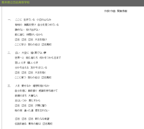 (鹿本商工、市立必由館、信愛女学院、尚絅、玉名工業、玉名女子、鎮西、小川工業、小国は歌詞を探しきれませんでした。もし歌詞に阿蘇というワードが入っているのであればご一報ください!)
