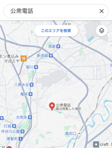 というわけで次は、ワタクシの趣味でもあるGoogleマップで「公衆電話」と検索してみることにしました。