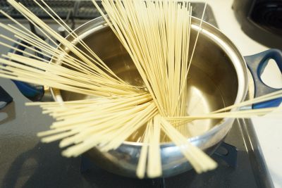 沸騰したら、鍋の中に麺を入れていきます。