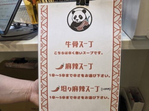 スープは、辛さが全くない牛骨スープ、1辛~5辛まで選べる麻辣スープと坦々麻辣スープの3種類です。
