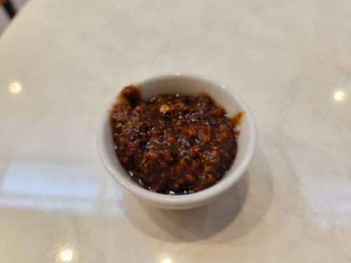 先ほどご紹介した通り、牛骨スープは全く辛くないのですが、少しだけ辛さが欲しい、やっぱり辛さなしだと物足りない、という方には少量の麻辣を頂けます。こちらは、麻辣のタネ。