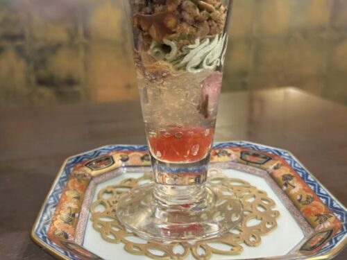 そして「千代の園」の名酒「泰斗(たいと)」をジュレにして(アルコールは飛ばしてあります!)、嘉島町(かしままち)の藤瀬農園で作られたミニトマトの一種、アイコトマトのコンポートがINしております。