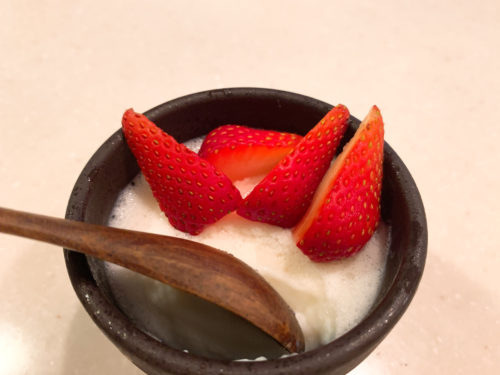 彩りに熊本県産のいちご「ゆうべに」を飾って完成。泡立ってしまった部分はそのまま泡っぽく固まっていますが、ちっちゃいことは気にしない。