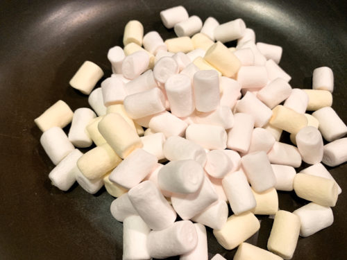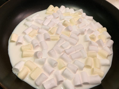続いて牛乳を投入。何やらファンシーな見た目です。真っ白のマシュマロがなくて色付きだけど大丈夫かしらん。