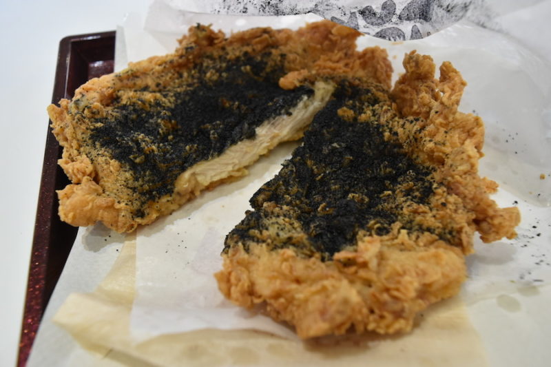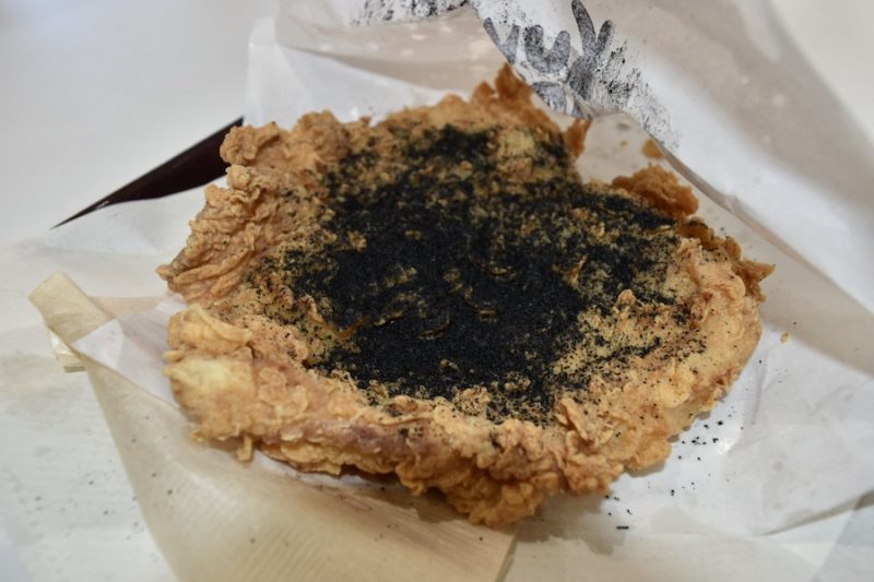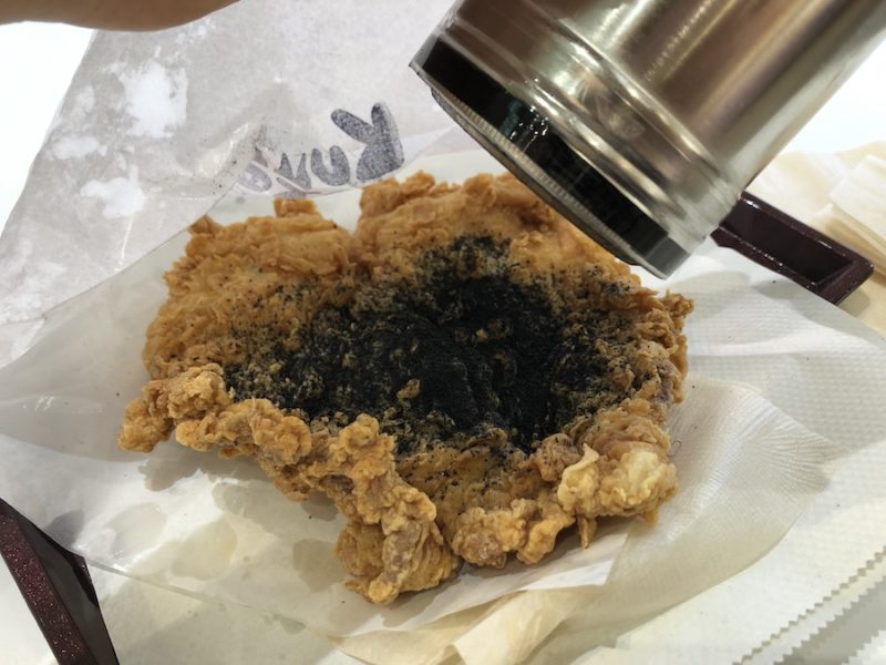 今回は、撮影のために最初は何もかけない状態で出していただいたので、自分でかけています。通常は、レジでフレーバーを選べばカラアゲにかかった状態で出てきます。ちなみに、ブラックソルトって炭塩らしいです。