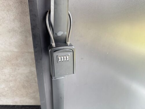 玄関にこのようにキーボックスがかけられて、指定された番号まで動かすと鍵を開けられます。