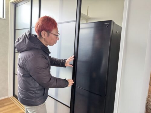 生活感が出ないように冷蔵庫や炊飯ジャーなどキッチン用品はこの扉の奥に収納されていました。