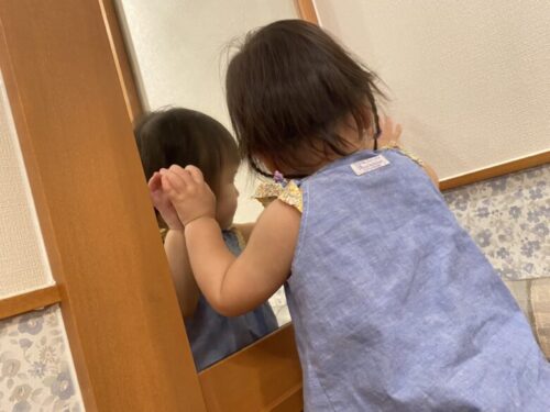 この鏡になってる壁、子供ウケが良くて良いなぁ。(触れる前後に持参したウエットティッシュで拭いています)